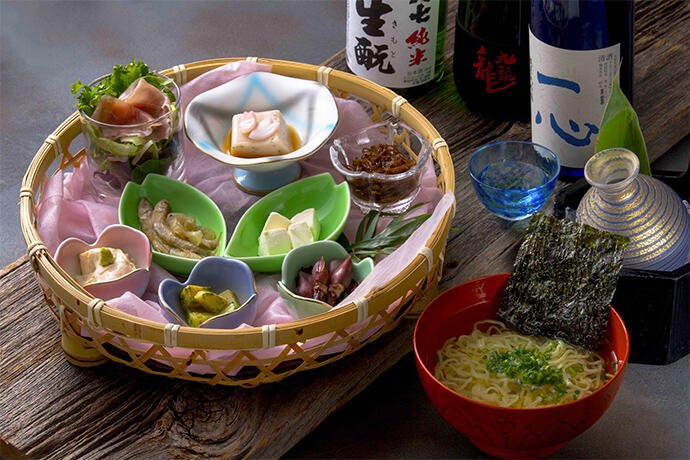 細やかな日本情緒を込めた四季折々の旬の味わいや日本各地から吟味して集めた銘酒を、料理人自慢の包丁さばきとともにお愉しみいただけます。その日に仕入れた新鮮食材を、職人の技とセンスで仕上げる逸品料理をご提供いたします。自分好みの日本酒を探せる「三種飲み比べ」もご用意しております。お食事とともにごゆっくりご堪能ください。