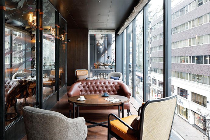 3Fのエレベーターを降りるとすぐ目に飛び込んでくるのが、全長約7mのバーカウンターと、赤を基調とした鮮やかな絨毯が印象的な4Fへと渡る大階段。空間を見渡せて、くつろげるラウンジエリアも充実しています。和のテイストを象徴するユニークで独創的なシグネチャーカクテルなど、素材を楽しむカクテルから、幅広い種類のドリンクをご用意しております。人気のアフタヌーンティーもカフェタイムにご提供。用途により使い分けができる居心地の良い空間です。