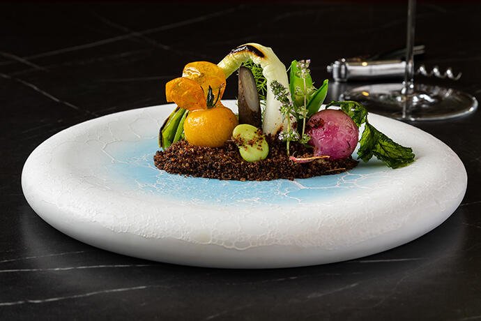 「真っ白なシェフコートと、背の高い帽子に憧れ、17歳でフランス料理の道に進み40余年。私のルーツである九州に帰って参りました」と、店主の坂井宏行。自然に育まれた素材を活かした料理と、明るい配色でコーディネートされたインテリアで、楽しいひとときをお過ごしください。