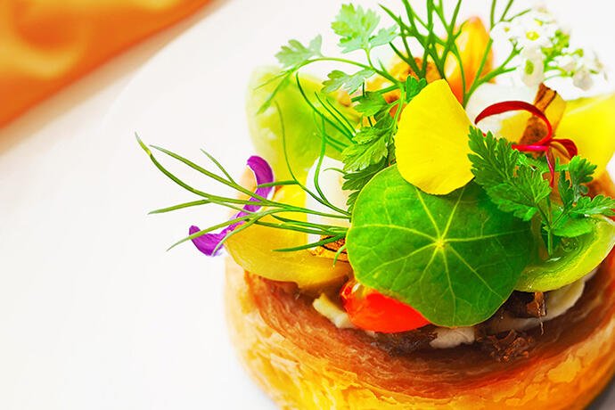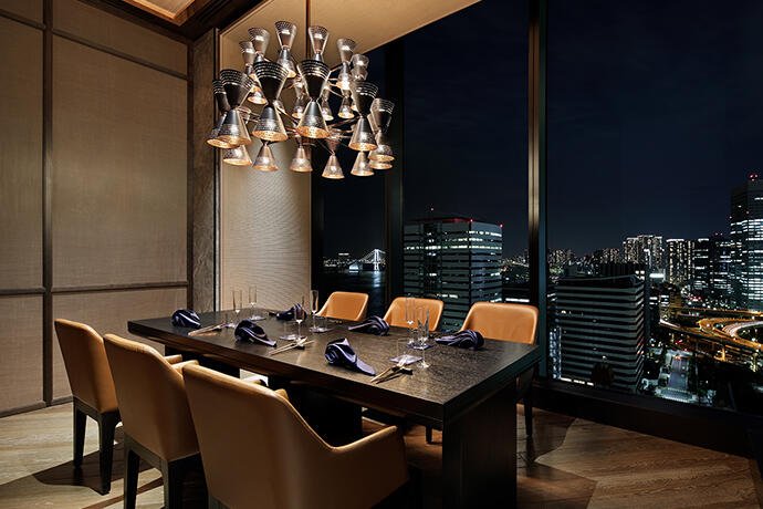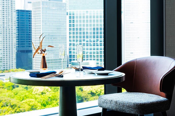 繊細なシェフの技と東京だからこそ集まる旬の食材を生かし、"シェフの劇場"という名の通り、まるで観劇するようにストーリーとともに紡がれるお料理の数々をお届けします。日中は浜離宮恩賜庭園の爽やかな緑、夜は都心の煌めく夜景に包まれ、華やかでダイナミックなアートが目を引く空間で、五感で味わう美食体験をご堪能ください。