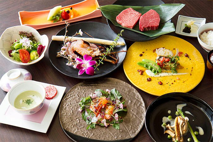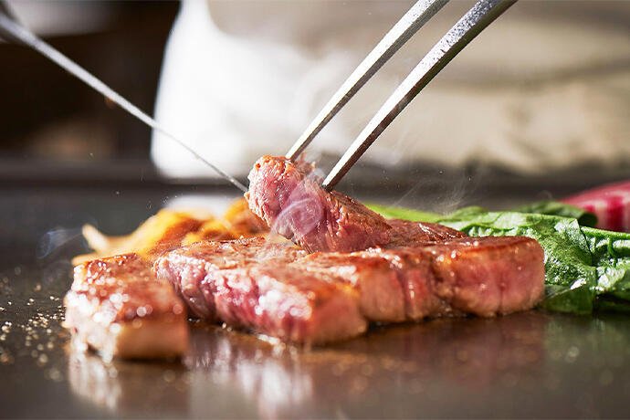 厳選の黒毛和牛を使ったメインのステーキをはじめ、地元御殿場や静岡県の風土に育まれた食材を用いた鉄板焼料理をご堪能いただけます。鉄板焼の醍醐味である音や芳醇な香りを間近で感じられるカウンター席の他、落ち着いた雰囲気で庭園の噴水ショーを眺めながらお食事ができるテーブル席もご用意。また、料理とのマリアージュを存分にお愉しみいただける、上質なシャンパンやワインの数々を最高の状態でご提供いたします。
