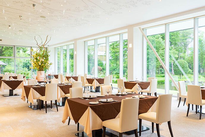 ホテルの庭園を望む、開放的かつ非日常的な空間で、本格的なイタリア料理をお愉しみいただけます。駿河湾の鮮魚、富士山麓で育った家畜たち、箱根西麓三島野菜など、食材の宝庫といわれる静岡県や地元御殿場の食材をふんだんに取り入れ、温もりある優美な一皿に仕上げてご提供。静岡限定の地ビールをはじめ、ワイン、ウイスキー、オリジナルのカクテルなども豊富に揃っています。大きな窓から眺める庭園の噴水ショーも見どころです。個室や80名様程度のご宴会にも対応したメインホールを備え、貸し切りでご利用もいただけます。