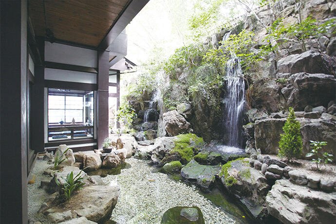 当店の店内には滝が流れる庭が見渡せる客室が多数ございます。大きく動くかに看板が目印の八事店。八事界隈のランドマークとしても親しまれています。