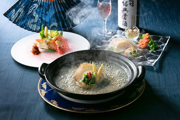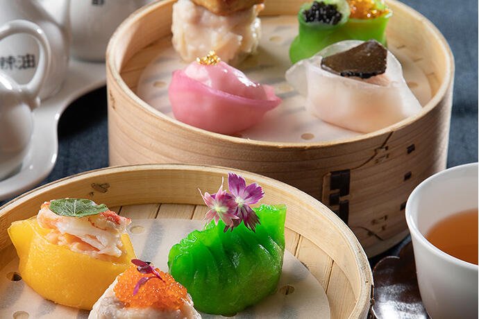 店内は伝統とモダンが融合し、美しい照明が包み込む中でアート作品も愉しんでいただける上質な空間。地元・愛知県の新鮮な食材をふんだんに使用し、名古屋ではめずらしい海鮮活魚料理をお愉しみいただけます。香港点心師が仕上げる「飲茶コース」は見た目も麗しく女性におすすめのコースです。