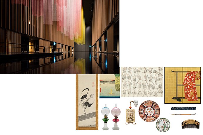 北斎、広重などの浮世絵、若冲、芳中、白隠といった江戸名画の名品、江戸から明治にかけて制作された工芸品はもちろんのこと、現代にまで連綿と続く左官、染色や蒔絵の技法を駆使したインスタレーションなど、多様な美がそこかしこにあふれています。