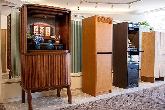 大田区や品川区、目黒区はもちろん、川崎市や世田谷区からもご来店いただいている城南地域唯一の現代仏壇直営店です。ミニ仏壇や壁掛けタイプなど、バラエティ豊かな80種類を展示。仏事のご相談から納品後のアフターフォローまで、きめ細やかな応対をいたします。