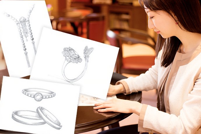 店舗では、デザイナーがご要望を伺いながら無料で何枚でもデザイン画を描きその場でご提案。完成前に原型のチェックも可能です。お持ちの宝石や貴金属を活用してのジュエリー製作も行っておりますので、ご自宅で眠っている指輪やネックレス、宝石などがありましたらぜひお持ちください。店内はアール・ヌーヴォーを思わせる柔らかな曲線に囲まれた空間が広がり、ゆったりとくつろぎながらジュエリー選びをお楽しみいただけます。