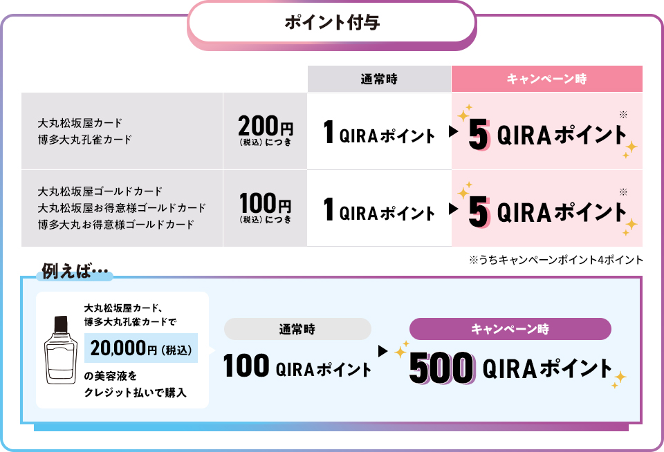 エントリーのうえ、ご利用期間に大丸・松坂屋各店の化粧品売場にて対象カードでのクレジットお支払いでQIRAポイントが通常時の5倍となります。