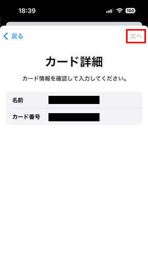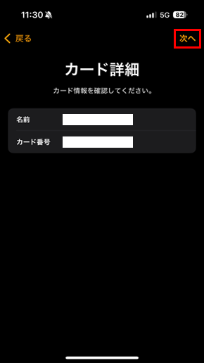 ⑥「名前」「カード番号」を確認し、「次へ」をタップ