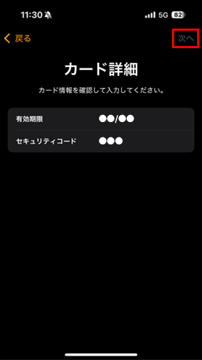 ⑦「有効期限」と「セキュリティコード」(カード裏面3桁の数字)を入力し、「次へ」をタップ