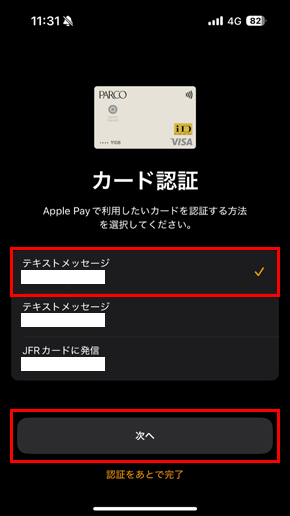 ⑪「テキストメッセージ(SMS)」で取得した「認証コード」を入力し、「次へ」をタップ