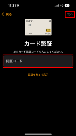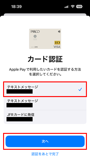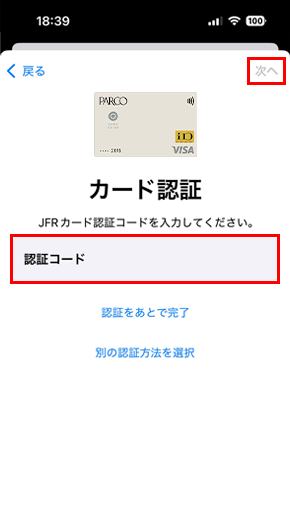 ⑫「テキストメッセージ(SMS)」で取得した「認証コード」を入力し、「次へ」をタップ