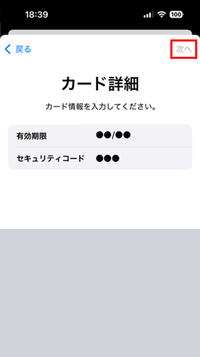 ⑧「有効期限」と「セキュリティコード」(カード裏面3桁の数字)を入力し、「次へ」をタップ