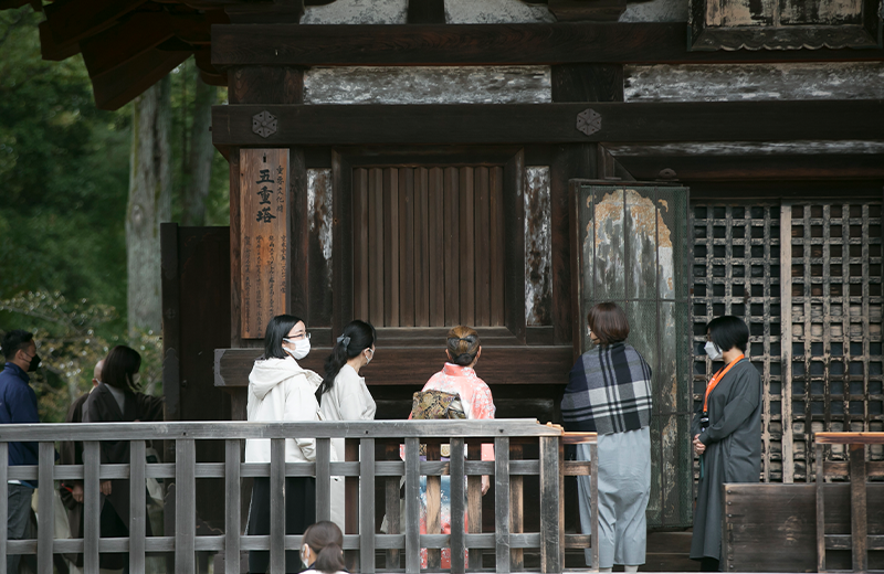 さらに、プライベートツアーでは、慶長年間に京都御所より移築され、現存する最古の紫宸殿であり当時の宮殿建築を伝える建築物として国宝に指定されている「金堂」、中央に八面体の回転式書架(輪蔵)を設け、多数の経箱が備えられている「経蔵」、徳川三代将軍家光の寄進によって建立され、大日如来と無量寿如来などの胎蔵五仏を安置し、柱や壁面には真言八祖、菊花文様などが描かれている「五重塔」を拝観。普段は立ち入ることのできない聖域に足を踏み入れ、建造物に秘められた深い歴史や逸話に耳を傾けるひとときは、深く思い出に残ることでしょう。