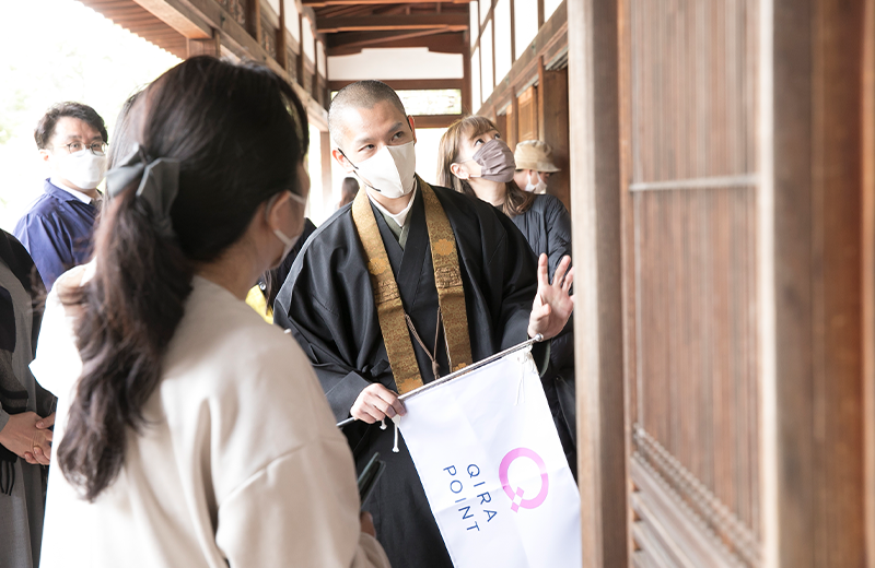 今回、尾形光琳・乾山の自邸を移築した重要文化財の茶室「遼廓亭」や、蔵をリノベーションした和モダンな「食堂-Jikido-」で茶点や和菓子づくりをお楽しみいただくほか、僧侶のご案内で非公開の伽藍をめぐるプライベートツアーを実施。普段では立ち入ることのできない特別な空間がイベントの舞台となりました。