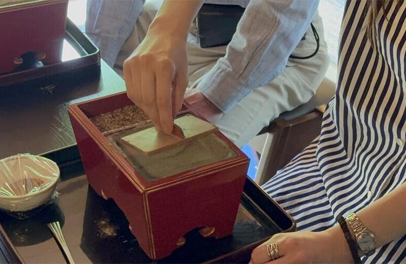 香箱のなかに敷かれた灰を、取手がついた小さな板で軽く押さえながら平らにならし、木の板で押さえるようにコの字型の溝をつけます。そして、その溝のなかに火種となる「抹香(香木のかけらを粉末にしたもの)」を敷き詰め、その上に「焼香(香木のかけら)」を盛っていくという非常に繊細な作業。「力加減が難しいね!」と時折笑顔をこぼしつつも、精神を集中し真剣に取り組む様子が伺えました。