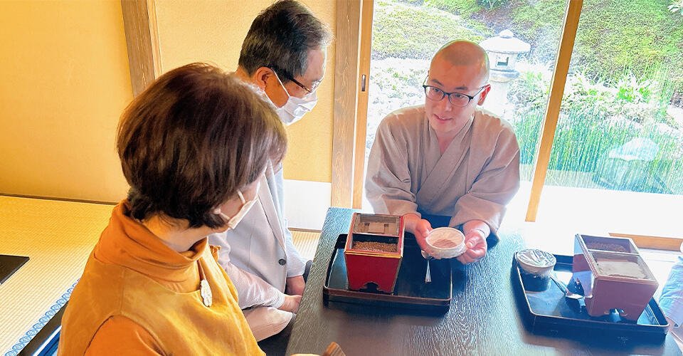仏様に香りを供える準備をする「香盛り」は、重要な仏事のひとつ。仁和寺で日々修行に務める僧侶が講師となり、香盛りの意味や道具の説明、作法の手順など、一つひとつ丁寧にレクチャーしながら、参加者皆さんの香盛りづくりをサポートしてくださいました。