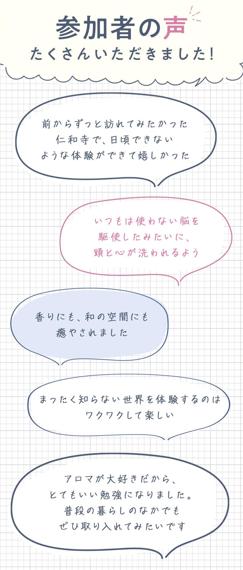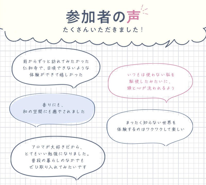 お帰りの際には、「ぜひ、毎日の暮らしのなかに、ゆっくりとリラックスする時間を楽しんで」とのご提案を込め、ご自宅で楽しめる香盛りのセットをお土産としてプレゼント。会員様からたくさんの喜びのコメントをいただき、大盛況のうちに幕を閉じることができました。