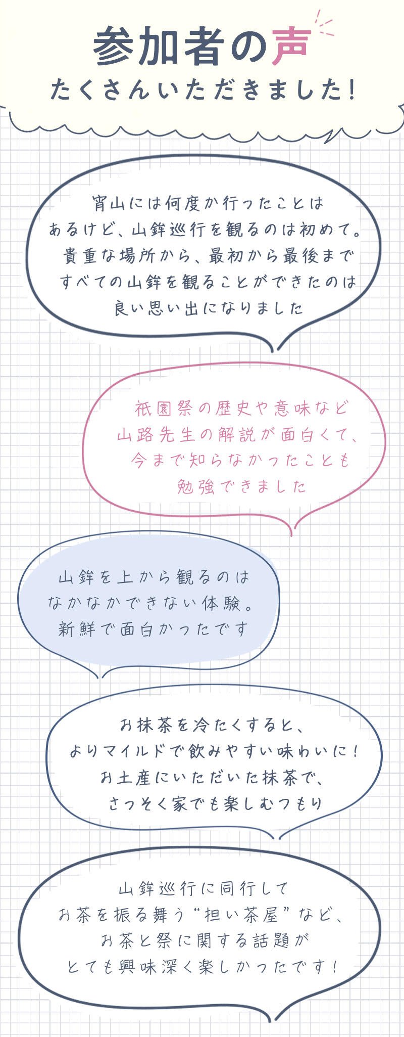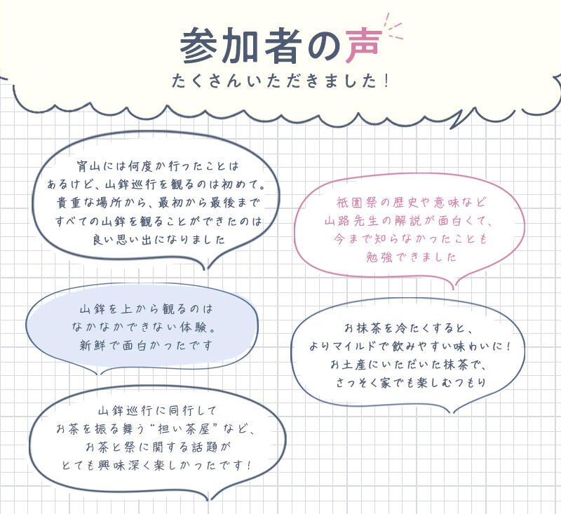 ガイドを務めてくださった山路先生からも「4~50年、祇園祭を研究してきましたが、高いビルから下に鑑賞したのは初めて。地上や家屋の2階とはまったく異なる景色が広がって、新しい楽しみ方ができましたね。また、若い世代の方々からいただく質問は、私たちとは違う視点が面白くて。"そんな見方もあるのか!"と、新鮮な発見でした」と、嬉しいお声をいただきました。