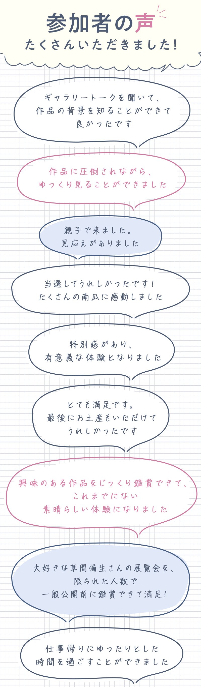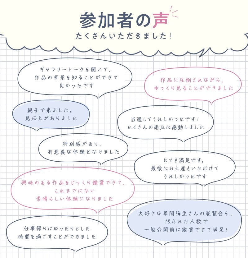 また、「ほかの会場で行われた展覧会にも行きましたが、今日はゆっくり鑑賞できて良かったです」「ラメが使われた作品は初めてでした!」と喜びを語ってくださる方や、草間彌生作品をイメージしたネイルデザインにされている方も。皆様の熱い想いに会場が満たされた、素敵な特別体験になりました。