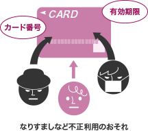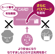 住所や電話番号、カード番号など必須事項の入力に加え、当社が通知した認証コード(ワンタイムパスワード)を入力することで、本人認証(インターネット上で打ち込んだカード番号の利用者がカード名義のご本人の方であることを確認すること)ができ、他人のなりすましによる利用などを防ぐことができます。
