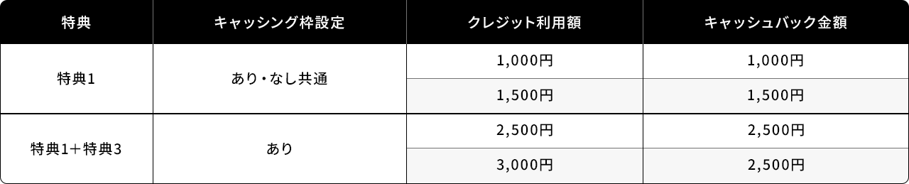 特典1+特典3が対象となる場合は、最大2,500円分がキャッシュバック対象となります。