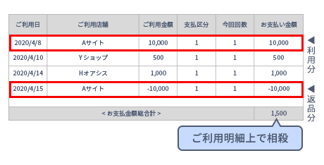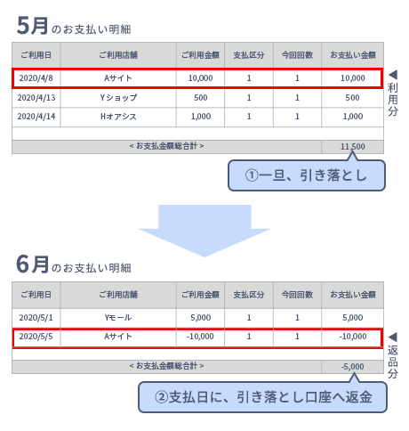 ご返金は、カードご利用代金のお支払い日に請求金額からの差し引き(ご請求とご返金が相殺)となる場合と、一旦お支払い日に引き落としされた後、その翌月のお支払い日に返金となる場合がございます。