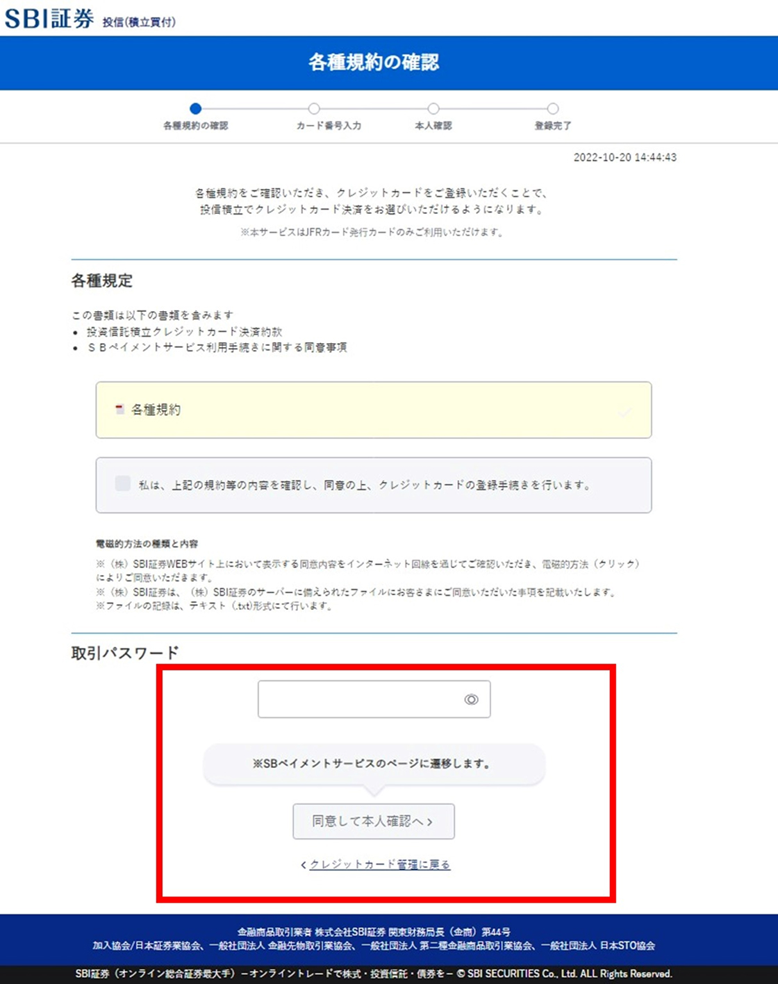 ⑤各種規約を確認のうえ、「取引パスワード」を入力し、「同意して本人確認へ」をクリック