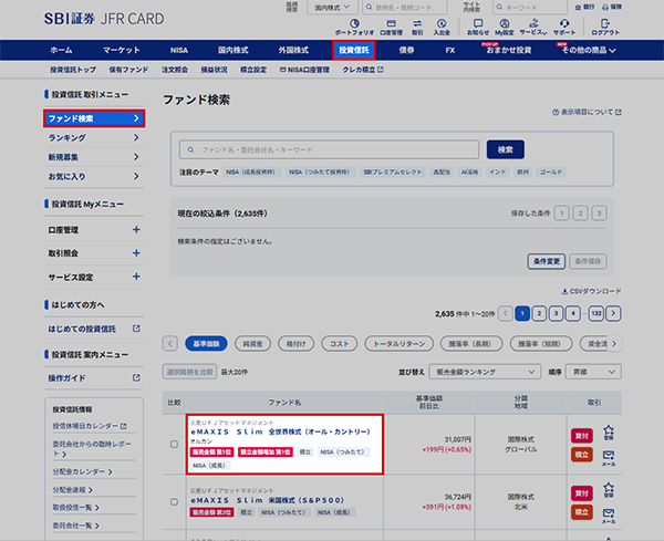 ①「投資信託」タブより「ファンド検索」をクリックし、