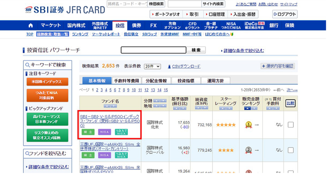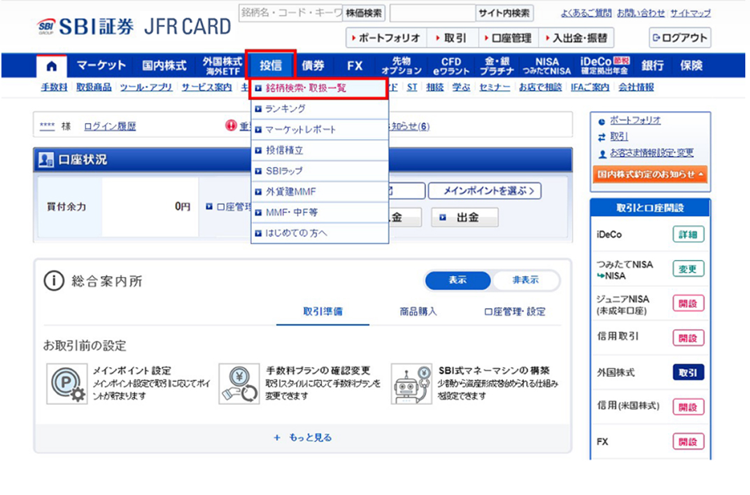 ①「投信」タブより「銘柄検索・取引一覧」をクリック