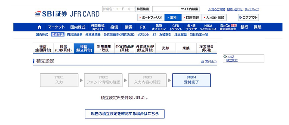 SBI証券WEBサイトログイン後『取引』>『投資信託』>『投信(積立買付)』>『クレジットカード』にて、クレジットカード決済サービス(クレカつみたて)の登録・設定変更や現在の設定状況をご確認いただけます。