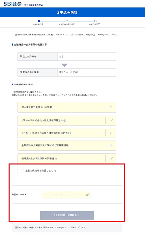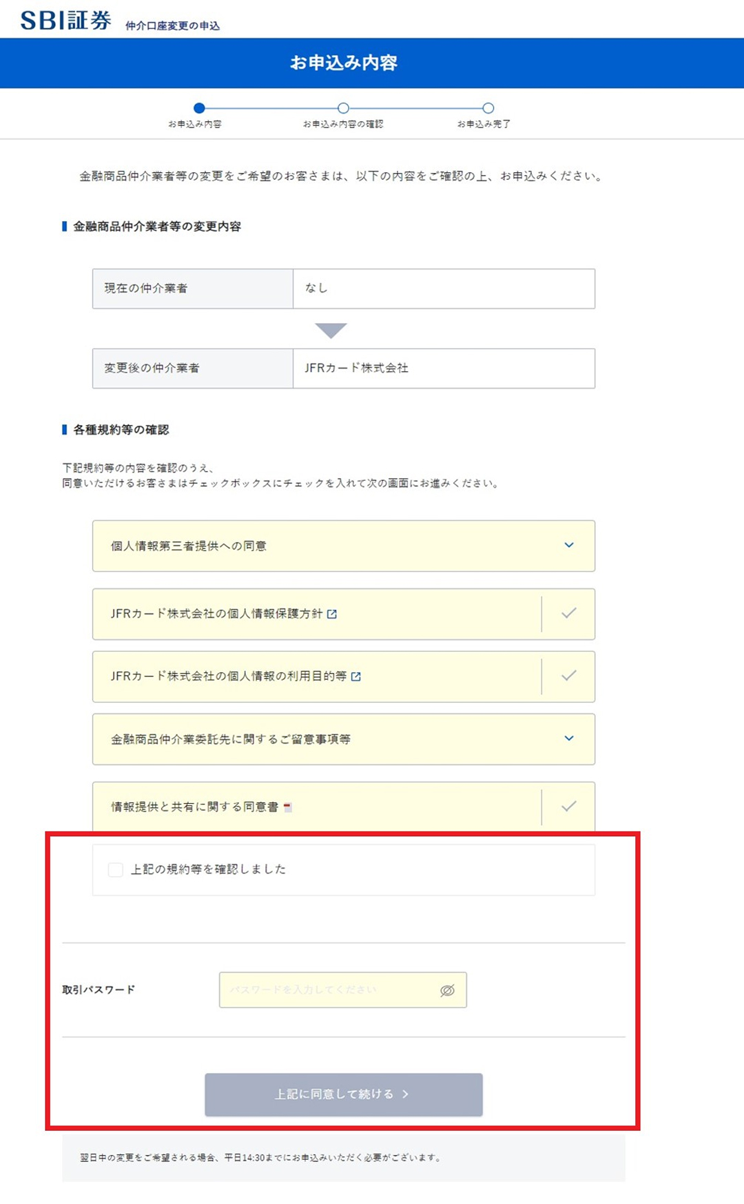①規約を確認のうえ、取引パスワードを入力し「上記に同意して続ける」