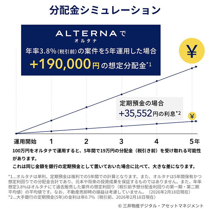 ALTERNAでは預金に代わる安定的な資産形成を目指しており、年1~3%程度の配当利回りを提供することを目指しています。