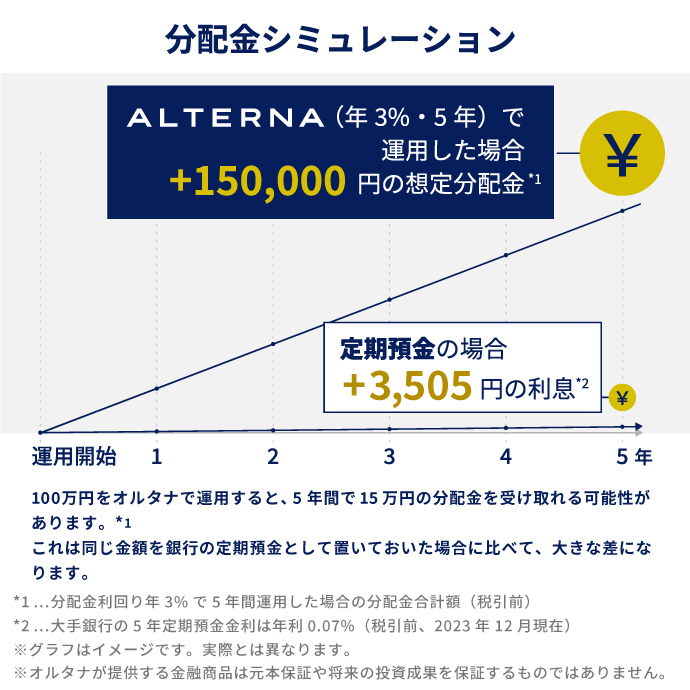 A ALTERNAでは預金に代わる安定的な資産形成を目指しており、年1~3%程度の配当利回りを提供することを目指しています。