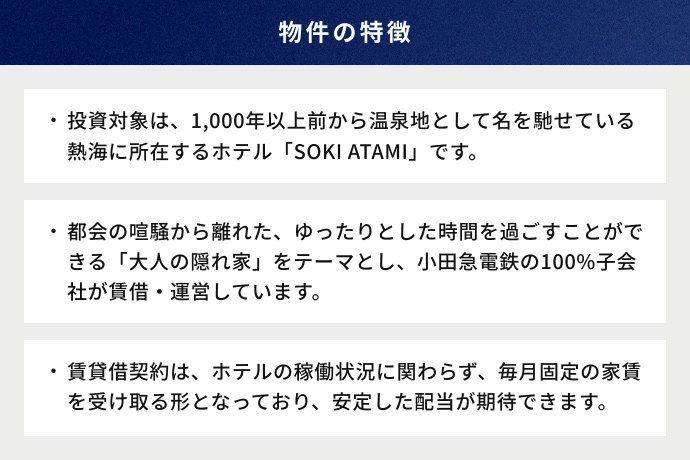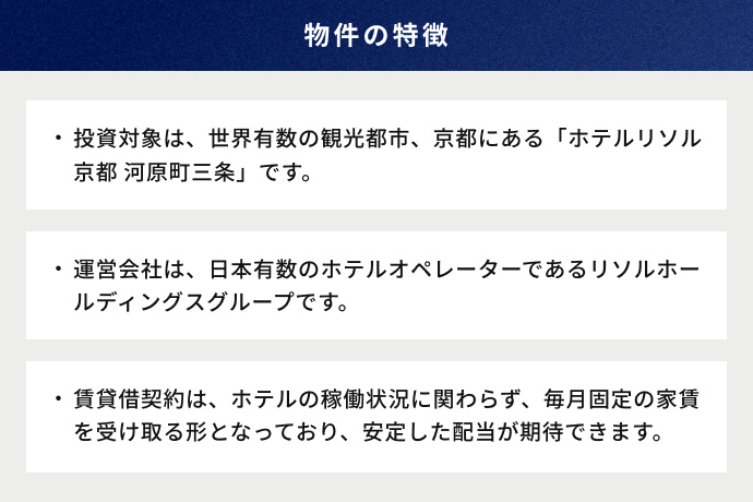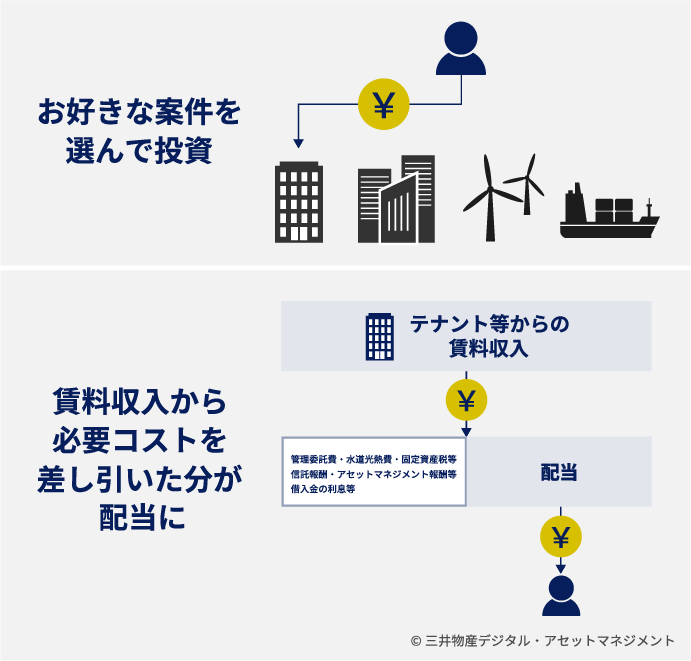 • 三井物産グループが厳選した安定した賃料収入に期待ができる不動産やインフラなどの資産への投資機会を提供します。