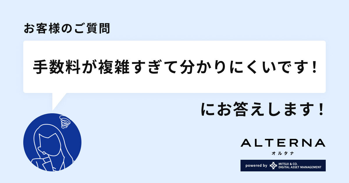 • お取引に際しては、手数料等がかかる場合があります。各商品等への投資に際してご負担いただく手数料等及びリスクは商品毎に異なりますので、詳細につきましては、三井物産デジタル・アセットマネジメントWEBサイト(ALTERNA)の当該商品等のページ、金融商品取引法に係る表示又は契約締結前交付書面等をご確認ください。
