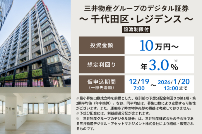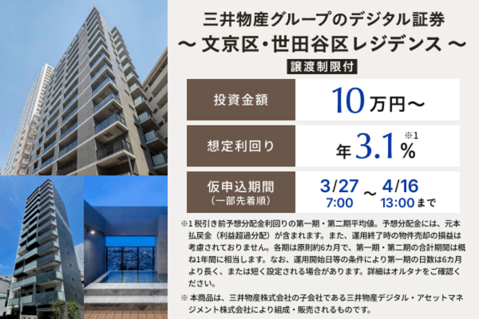 A ALTERNAの最低投資金額は、原則10万円のため、少額から投資することが可能です。また、ALTERNAで取り扱う、レジデンス投資商品は、複数戸のマンション一棟以上を投資対象とするため、ワンルーム1戸よりも空室リスクが分散されることに期待ができると三井物産デジタル・アセットマネジメントは考えています。