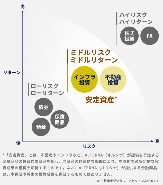 • 「預金よりは利回りが高く、株よりは安定」安定した賃料収入が期待できる不動産やインフラ資産は、そんなミドルリスク・ミドルリターンの資産です。